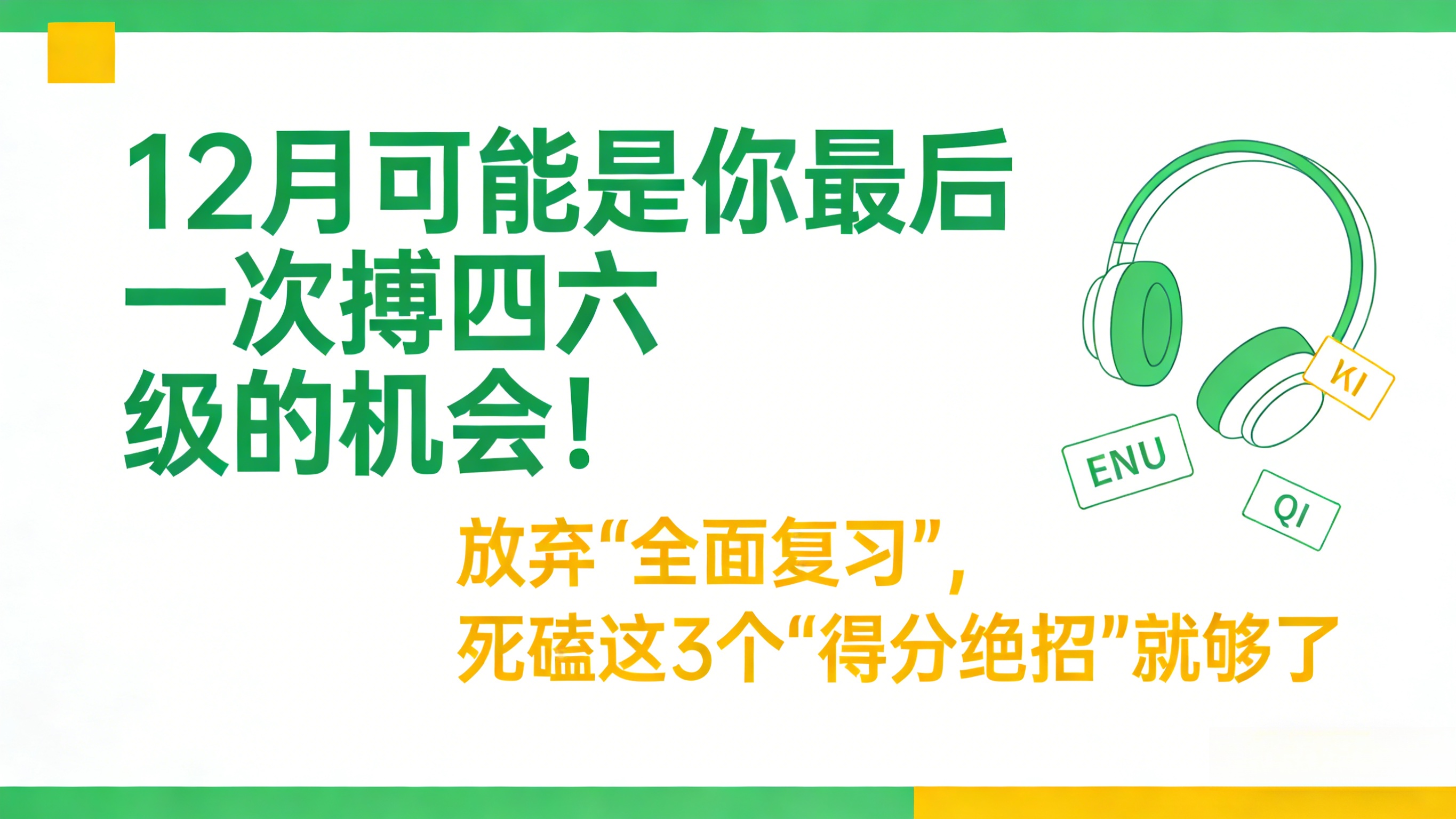 2025年12月四六级考试的最后冲刺期,不少考生仍在盲目刷题、死记硬背,陷入 “付出多收效少” 的低效困境。数据显示,近 5 年四六级真题中,60% 以上的分值来自技巧性极强的核心题型,掌握关键 “偷分模块” 能让复习效率翻倍。结合最新考试趋势与真题规律,趣厚博提炼出两大必抓模块,帮你精准突破得分瓶颈,稳稳过级。 模块一:听力 “关键词定位法”—— 答案藏在关键词后,正确率提升 60%听