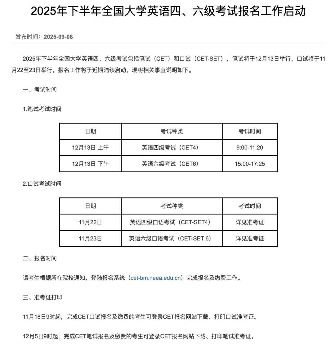 中国教育考试网已正式启动 2025 年下半年英语四六级报名工作。本次笔试将于 12 月 13 日举行,口试安排在 11 月 22-23 日,但各省报名时间差异显著,部分省份报名已进入倒计时阶段。本文将汇总最新报名信息并提供科学备考规划,助你顺利通关。一、各省报名时间紧急预警根据各地教育考试院最新公告,2025 年下半年四六级报名呈现 "南北错峰、周期悬殊" 特点。以下